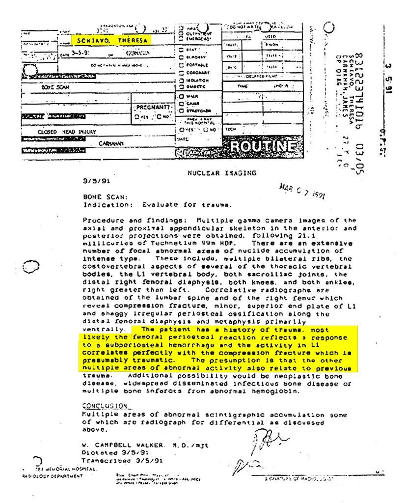 came home around 2:00 in the morning, climbed into bed. [Terri] .... She woke up, said good night, gave me a kiss. I gave her a kiss back. click here for transcript Author's Note: This statement by Michael Schiavo is extremely damaging to his cause in that he, the person he alleges knows his wife best, finds no irregularity in his wife's speech patterns or physical condition at around 2 A.M., to indicate the extremely severe Hypokalemia she presented with 3 hours later. Michael Schiavo states that when he arrived home from work around 2:00 A.M., Theresa Schiavo woke up (was alert and aware of her surroundings and of his presence), said goodnight (had verbal and cognitive skills), and gave him a kiss (demonstrated emotions, cognitive skills, and normal range of motion for muscles. Michael Schiavo reported nothing abnormal. Only TRAUMA can cause this type of quick-onset Hypokalemia. The Smoking Gun: The Hypokalemia profile that Theresa Schiavo was diagnosed with is unique, and trauma is reportedly the proximate cause, according to studies published by the National Institute of Health in 2002. click here. Hypokalemia does not cause skeletal trauma - physical force (violence) does. This is very damaging for Michael Schiavo, since he was the only person present who could inflict TRAUMA to Theresa Maria Schiavo, documented in a bone-scan 53 weeks later, well within the 18 month window for skeletal Technetium uptake. |